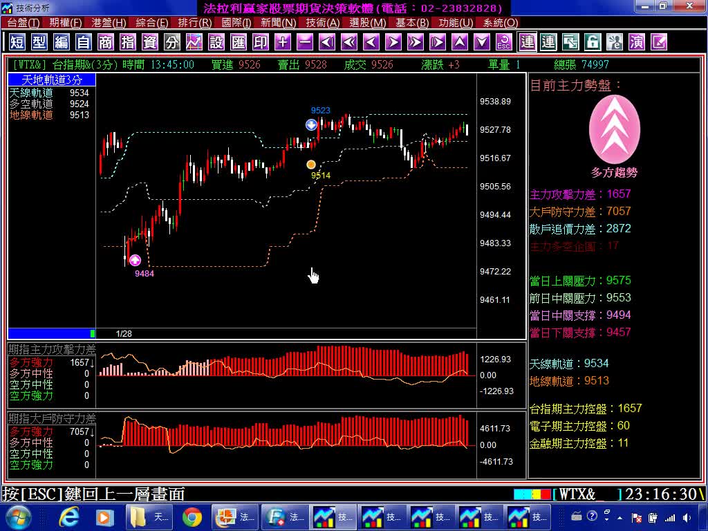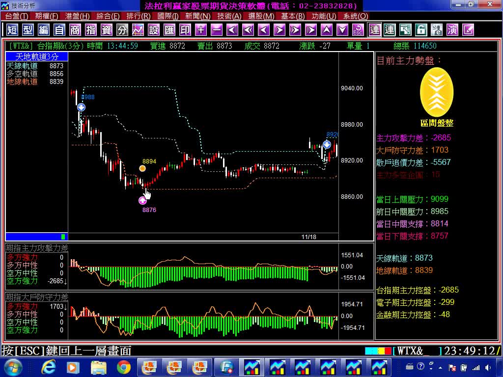台灣唯一盤整盤&趨勢盤均可獲利的台指期當沖看盤軟體,天地軌道2分與3分的差異及趨勢性指標與轉折性指標不同之處,實例印證影音教學。(1040814)